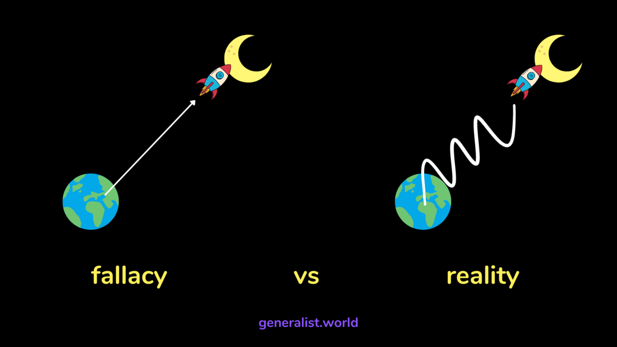 However, the ‘best’ path is not always the most obvious or practical at surface level. As this example illustrates, the path of a rocket from the earth to the moon presents more like the second half of the image - a jagged line, a series of corrections and continuations - and may look inefficient at first glance. But that is the reality.