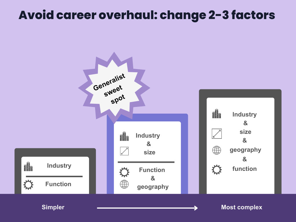 For instance, transitioning from being a product manager [function] at a tech firm [industry] in the US [geography] to becoming an HR generalist [function] for a UK government agency [geography, industry], or shifting from being a freelance designer working remotely in Asia to becoming a community manager for a local non-profit in New York.